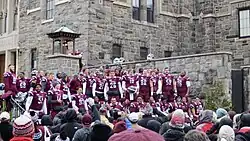 Since then the bell has been rung by senior football players directly after home wins or upon returning to campus following road victories. Underclassmen are required to lift each senior, one at a time, so each can have a turn at ringing the bell. Afterwards the entire team, with the school band playing along, sings Fordham's fight song for gathered fans. Once strictly a football tradition, the bell has been used by other teams for special occasions. Most importantly, the Victory Bell is used to commence graduation ceremonies. In 2021 HeroSports ranked the ringing of the Victory Bell as the 7th best tradition in all of FCS.[11]