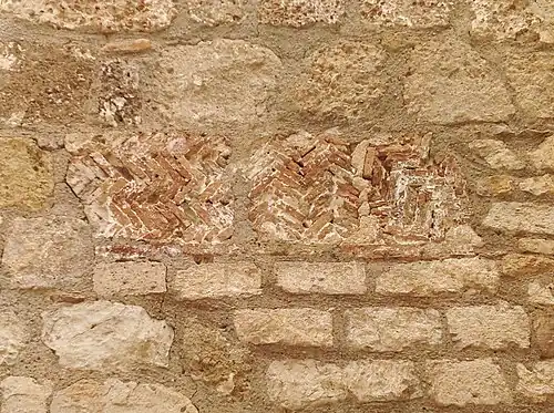 Opus spicatum inlays in the facade of the present building, originally the right wall of the early medieval church.
