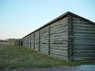 Restored Fort Kearny State Park looking from parade ground southwest over marked-off officers barracks foundation.