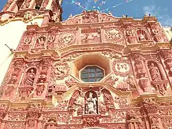 It stands out for its balanced composition and very narrow bell tower, which is integrated into the façade. The sculpture on this facade is considered the best of the five according to the Mexican Archeology magazine.