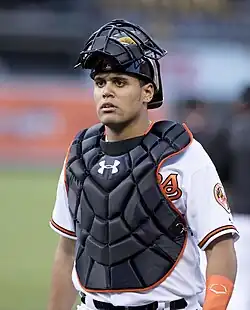 On the same day he was designated for assignment by the Royals, Peña was traded to the Baltimore Orioles in exchange for cash considerations.[6] He played in 24 games for the Norfolk Tides of the Triple–A International League, before he was promoted to the major leagues on May 31, 2016, while Orioles backup catcher Caleb Joseph went on the disabled list.[7] On June 2, Peña started and debuted for the Orioles. He went 2-for-4 with two RBI and hit his first major league home run to help the Orioles defeat the Boston Red Sox 12–7. Peña ended his 2016 season with a .200 batting average, one home run, and three RBI.