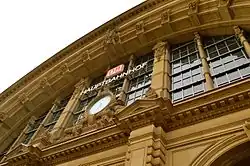 During the Second World War, the station was the target of Allied air raids, for instance on 11 December 1944, when almost 1000 tons of multi-purpose bombs were dropped on the station.[7] However, it had already been damaged by air raids on Frankfurt am Main. Above all, the glazing of the platform halls was destroyed.[8] In order to protect the passengers from rain, the former glass surfaces were partly closed with wood, a temporary solution that remained in place for almost 60 years. Offices that did not necessarily have to be on site for operational purposes were outsourced, the lost and found office for example to the Frankfurt-Höchst station.[9]
