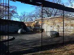 The Long Crouch Woods, the location of the historic "Bear Dens", is also located within the park. Once the focus of the zoo, the Bear Dens were designed and built in 1912, and were planned to have a small collection of domestic animals. The original grounds featured a grand staircase leading to a large courtyard, framed by several large iron bear cages. One of these cages featured a detailed stone sculpture of bears and the crest of the City of Boston.[5] Plans of expanding the Long Crouch Woods section of the zoo never came to fruition. As the grounds deteriorated, and as the Parks Department neglected many of the landscape's most basic management needs, the Bear Dens became too expensive to maintain. The exhibit area was officially closed in 1954. It was later lopped off of the zoo property permanently in 1958, when the Metropolitan District Commission took over management of the zoo.