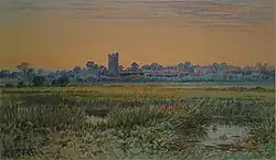 George Gordon Fraser (1859–1895), like his eldest brother Frank, showed great promise as an illustrator. His drawings and cartoons appeared in Fun magazine and he provided "upwards of one hundred and twenty illustrations" for an 1891 edition of Jerome K. Jerome's The Diary of a Pilgrimage.[7] A reprinted version of this is still available though fails to credit G.G. Fraser as the artist. He also painted, in watercolours and occasionally in oils, signing 'G. Gordon Fraser' or using his initials. William Andrew Baird Grove, in his booklet The Frasers – A Local Family of Artists (1980) describes George Gordon's work as "a wide variety of Fen scenes of painstaking detail and accuracy, no longer fashionable in today's art. His brushwork was very fine and it appears that every single twig and every leaf is given individual attention." There are noticeably fewer examples of his work in circulation as he died young, at the age of 35, having fallen through the ice while skating on the River Ouse. He was buried with his father in a secluded spot in the graveyard of St. James's Church, Hemingford Grey, a village between Huntingdon and St. Ives, Cambridgeshire.[2]: p54