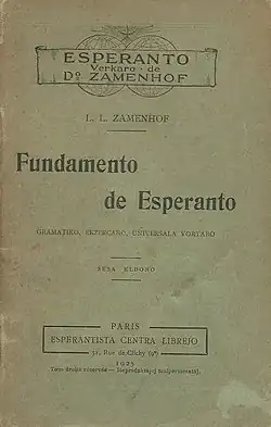 Fundamento de Esperanto (English: Foundation of Esperanto) is a 1905 book by L. L. Zamenhof, in which the author explains the basic grammar rules and vocabulary that constitute the basis of the constructed language Esperanto. On August 9, 1905, it was made the only obligatory authority over the language by the Declaration of Boulogne at the first World Esperanto Congress. Much of the content of the book is a reproduction of content from Zamenhof's earlier works, particularly Unua Libro.