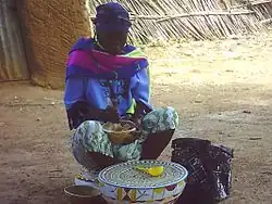 Fura or doonu is a type of food originating from West Africa's Sahel region and that is popular among the Zarma-Songhai, Fulani and Hausa peoples of the Sahel.[1][2] It is a millet dough ball, with "fura" meaning millet ball. It is also eaten in Niger and Ghana.[3] The millet is ground into a powdered form, rolled and molded into balls, then mashed and mixed with Nono - a fermented milk.[4][5] The combination of fura and nono is known as Fura Da Nono, a locally made drink that contains carbohydrate and fiber.[6] The fura food and the fura da nono drink are popular in Northern Nigeria. They are served on special occasions and as a meal in the afternoon.[7][8]