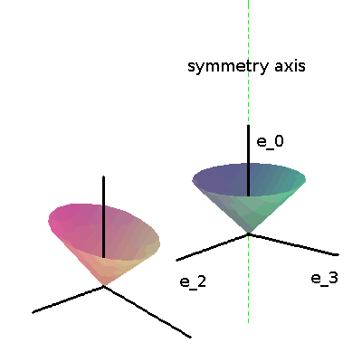 Two light cones (with their accompanying frame vectors) in the cylindrical chart for the Gödel lambda dust solution. As we move outwards from the nominal symmetry axis, the cones tip forward and widen. Vertical coordinate lines (representing the world lines of the dust particles) are timelike.