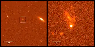 Optical afterglow of gamma-ray burst GRB 990123 (the bright dot within the white square and in the enlarged cutout) on January 23, 1999. The object above it with the finger-like filaments is its originating galaxy. This galaxy seems to be distorted by a collision with another galaxy.