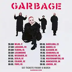 Garbage 2024 is a 2024 headline concert tour by American alternative rock band Garbage in support of their seventh studio album No Gods No Masters. Initially, the tour was solely a European tour which included dates in Scotland, Spain, Italy, France, England and Germany. By the conclusion of the European tour, Garbage announced three North American festival dates as an extension to the tour, with dates in Mexico and the United States,[1][2][3] however the North American leg was later cancelled after frontwoman Shirley Manson suffered an injury during the tour that would require surgery and rehabilitation as confirmed by the band's official Instagram account.[4]
