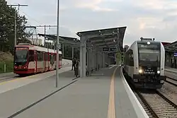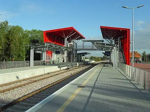 During its construction, Gdańsk Wrzeszcz–Gdańsk Osowa railway was partially prepared for future electrification: a project for the electrification of the entire line was developed, and special spaces were designated on viaducts for the installation of traction poles.[33] In February 2017, a tender was announced for a feasibility study on the electrification of Gdańsk Wrzeszcz–Gdańsk Osowa and Gdańsk Rębiechowo–Gdańsk Osowa R1 railways.[34] In March 2018, a decision was made to allocate 85% of the project's funding from European Union funds,[35] amounting to 61 million PLN, while the total estimated cost of the investment was 73 million PLN[36] (by the second half of 2020, the estimated cost was 89 million PLN).[37]