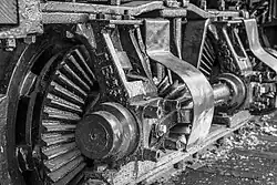 A wheel on a Shay locomotive. A shaft (seen towards the right of the photo) transferred power to a bevel gear (partially visible under a cover), which transferred power to the wheel.