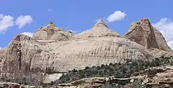 The Golden Throne, a rock formation in Capitol Reef National Park. Though the park is famous for white domes of the Navajo Sandstone, this dome's color is a result of a lingering section of yellow Carmel Formation carbonate, which has stained the underlying rock.