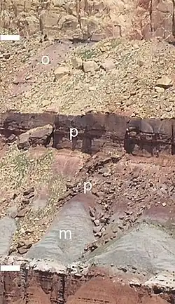 Chinle Formation section showing each member represented in the Capitol Reef area: Monitor Butte Member (m), the two units of the Petrified Forest Member (p) and the Owl Rock Member (o - partially obscured by overlaying Wingate rubble) (cropped image). Non-cropped version