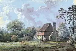 Sir George Colebrooke of Gatton Park in Surrey commissioned at least two paintings from Barret. Colebrooke was a London banker and also became chairman of the East India Company. He became the Member of Parliament for the rotten borough of Gatton in 1754 as a member of the Whig party and held office under the Marquess of Rockingham. However, his financial speculations led to his downfall and he was declared bankrupt in 1777. Sir George Colebrook had commissioned Capability Brown in 1762 to landscape Gatton and a painting by Barret, sold at Sotheby's in 2013, shows workmen completing the landscaping.[27] This painting was exhibited at the Royal Academy[28] with its counterpart, a view from the house overlooking the lake and the newly landscaped parkland[29] This painting shows Barret being influenced by Richard Wilson and moving towards a picturesque scene centred around a lake.