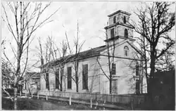 1872 photograph of the First Congregational Church of Kenosha at Park and Ashland, constructed in 1843 and moved in 1853.