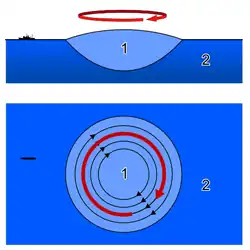 A geostrophic current is an oceanic current in which the pressure gradient force is balanced by the Coriolis effect. The direction of geostrophic flow is parallel to the isobars, with the high pressure to the right of the flow in the Northern Hemisphere, and the high pressure to the left in the Southern Hemisphere. The concept is familiar from weather maps, whose isobars show the direction of geostrophic winds. Geostrophic flows may be barotropic or baroclinic. A geostrophic current may also be thought of as a rotating shallow water wave with a frequency of zero.