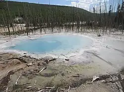 Blue spring with steam rising from it; irregular blotches of red and orange residue are on the banks, along with dead tree trunks.