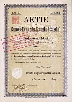 Share of the Gernrode-Harzgeroder Eisenbahn-Gesellschaft, issued 1. October 1889
