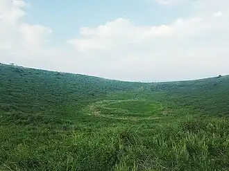 There is a caldera around 52 m (171 ft) deep[4] at the top of the mountain called Wangmae or Ammae (왕메; 암메).[3] It has an area of 30,000 pyeong (99,000 m2).[2] Within the crater is a marshy area that develops a pond after rain. This area is called Geumakdam (금악담; 今岳潭).[3][5][2] Amphibians live in this marshy area and have been affected by human activity at the top.[5][4]