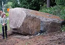 | Everett Boulder, erratic found 30 feet (9.1 m) underground at downtown construction site, Colby Avenue and Wall Street. 18 feet (5.5 m) long, and 10 feet (3.0 m) high, weighs approximately 300,000 pounds (140,000 kg).[6][7][8] The erratic briefly had over one hundred Twitter followers and was eventually reburied.[9] | |