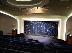 In 1986 GFT became a registered charity and embarked on a campaign to raise money for a second cinema to replace the old basement conference room. Screen 2 (with seats for 142), and the downstairs café-bar Café Cosmo, opened for business in 1991. Edinburgh-based architect James Doherty returned in 1998 to revamp the foyer; in a nod to the original design, the new foyer includes a mosaic globe designed by American Glasgow-based artist Todd Garner set into the floor. In the same period, new sets of curtains were commissioned from Glasgow School of Art graduate Adrienne Brennan (Screen 1) and Glasgow studio Timorous Beasties (Screen 2),[7] both of which reference the ‘cosmos’ in their design.