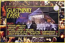 Glastonbury Fayre is a 1972 documentary film directed by Peter Neal and Nicolas Roeg.[1] It covers the 1971 Glastonbury Festival (then known as the Glastonbury Fayre) which took place on 20 to 24 June 1971 in rural Somerset in England.[2] It was released in May 1972.