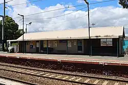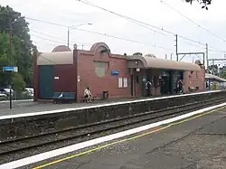 In the mid 1980s, as part of works to add a third track on the Frankston line, the western platform was converted to an island platform.[12] The original station building on this platform, built in the 1880s, was demolished. It was replaced with a brick building, which was opened on 1 July 1987 by the then Minister for Transport Tom Roper, and former Member for Glenhuntly Dr. Gerard Vaughan. It was also during this time that boom barriers were provided at the former Glen Huntly Road and the nearby Neerim Road level crossings, in 1986 and 1987 respectively.[13] On 28 June 1987, the up face of the island platform was brought into use.[14]