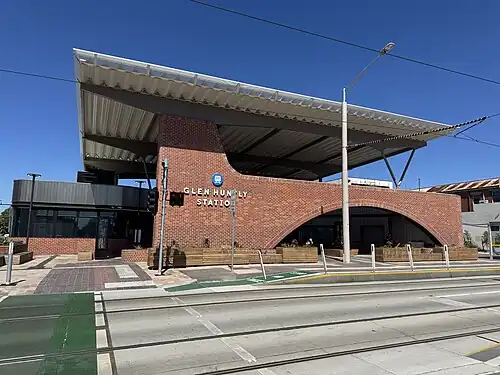 Glen Huntly railway station is a commuter railway station located in the south-eastern suburb of Glen Huntly in Melbourne, Victoria, Australia.[4] The station had various forms of the name Glen Huntly, which it initially opened as "Glen Huntly Road" upon its opening in 1881. It was renamed to Glen Huntly a year later on 1 September 1882, it was then renamed to "Glenhuntly" on 20 April 1937. It was given its current name to "Glen Huntly" on 13 April 2023 as part of the Level Crossing Removal Project.[5] Glen Huntly is a below ground host station, consisting of three platforms, a single island platform with two faces and a single side platform, connected by staircases, lifts and a ground level concourse on Glen Huntly Road. The station was previously at ground level upon its opening on 19 December 1881 until 31 March 2023; however, in July 2023, a new below ground station was provided and rebuilt as part of the Level Crossing Removal Project.[6]