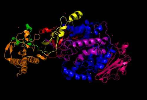 Glucansucrase in Streptococcus mutans. The domains are color coded. For domains made up of discontiguous segments, each segment was assigned a number. Shown here are segments IV1 (orange), B1 (red), A1 (blue), C (pink), A2 (purple), B2 (yellow), and IV2 (green).
