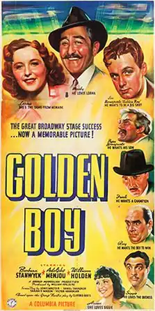 Golden Boy is a 1939 American drama romance sports film directed by Rouben Mamoulian and starring Barbara Stanwyck, Adolphe Menjou and William Holden. It is based on the 1937 play of the same title by Clifford Odets.[1][2]