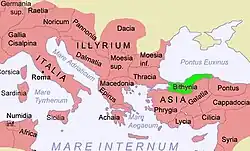 Up to the 20th century, Gordo-Servorum or Gordoservae was commonly equated with nova Juliopolis, which in turn was equated with Gordium (capital of Phrygia) or another place with the same name Gordion, Gordenorum, Gordiu-come(nis), Gordiū-tīchos which became known as Juliopolis (Iuliogordus) according to several 1st-century BCE up to 2nd century CE sources.[15][16][17] William Mitchell Ramsay (1890) connected Justinianopolis-Mela, called Nova Justinianopolis Gordi (680), with the bishoprics of Gordoserboi or Gordoserba in Bithynia, Gordorounia or Gordorinia in Phrygia Salutaris, and Gordou-Kome, the former name of Juliopolis in Galatia, and that an ancient country or district along the Sangarios River was called Gordos. Additionally, he argued that Gordoserba was formed into bishopric by Justinian I in the 6th century.[18] Siméon Vailhé, writing for the Catholic Encyclopedia (1913) considered, like Michel Le Quien, that Juliopolis of Nicaea of Bithynia was identical to Gordoserboi, because otherwise the exact location, titulars, and bishops are unknown; and that it should not be confused with Juliopolis of former Gordium.[19]