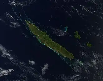 The island is located roughly 1,300 kilometres (810 mi; 700 nmi) east of Australia.[4] Grande Terre is oriented northwest-to-southeast; its area is 16,372 square kilometres (6,321 square miles). It is nearly 400 kilometres (250 miles) in length and 50–70 km (30–40 mi) wide in most places. A mountain range runs the length of the island, with five peaks over 1,500 metres (4,900 feet). The highest point is Mont Panié at 1,628 m (5,341 ft) elevation. Grande Terre is one of the largest islands in the Pacific Ocean.[5]