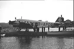 Deutsche Luft Hansa originally used Dornier Do J Wal aircraft. German mechanical crew arrived on 11 July and the first landing took place on 16 July, surrounded by festivities.[9] The first revenue landing took place at 18:30 on 18 July. The route flown was from Szczecin via Copenhagen and Gothenburg to Oslo. In addition to passengers, the service had carried post.[10] Flights lasted until 30 September when the season ended. Deutsche Luft Hansa had then flown 636 passengers and 9,591 kilograms (21,145 lb) of post.[9]