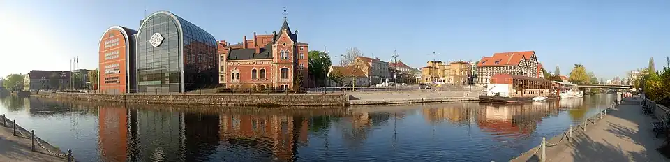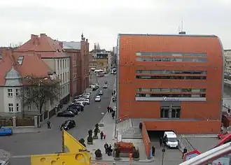 Grodzka Street is a historical street in Old Town of Bydgoszcz, Poland. The street is located in the northern part of the Old Town: it stretches along Brda River waterfront, following an east–west axis. The street starts at the intersection with Bernardyńska street and ends at Tadeusz Malczewski street's crossing. Its length is approximately 430 m. The Grodzka Street was laid out in mid-14th century, when Bydgoszcz became a charter city.[1] Grodzka Street buildings vary greatly one from the other, beginning with the three historic granaries from late 18th century, to the all-glass similar-shape modern mBank in Bydgoszcz, which became an icon of Polish architecture.