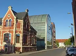 The brick-laid building makes reference to the neo-Gothic style, then the Prussian official style: it has been plastered later following Neo-Baroque references.[16] The old edifice is symmetrical, with two avant-corps along its axis, with a low-hip roof. On the avant-corps front, the basement door openings are in the form of a triple arcade. The avant-corps onto Grodzka Street is topped with an attic style parapet and pinnacles.[16] The recent building has a pseudo-tented roofed turret in a corner.[16] In the years 2006– 2008, the whole building has been refurbished.