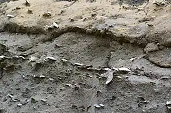 The bed is part of the larger Toukeshan Formation (頭嵙山層), a Pleistocene-era formation. The fossils date from between 1,030,000 and 460,000 years ago and are embedded in shale. The shells were likely located around 20 metres (66 ft) to 50 metres (160 ft) underwater before being covered. Fossils from 135 different species have been identified: most shells from the Pecten genus, but shells from Chlamys, Anadara, Arca, Eucrassatella, Nassarius, Niotha, Bursa, Turritella, and Murex have also been identified. Some suggested that the high density of fossils is due to repeated storms pushing the shellfish into this area.[2][3]