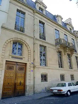 The building overlooks the Seine to the north of the island and does not fit the most traditional layout of an hôtel particulier, which usually features a main building entre cour et jardin, separated from the street on the front by a courtyard, and facing a private garden on the back.[9] Fitting the exceptional location of the lot, facing the river, Charles Chamois chose to place the main building on the front, and to raise the ground floor to protect it and ensure an enjoyable view of the river.[10] The high foundations serve as a service space. A richly ornamented balcony extends the main room on the street facade. The courtyard forms the back of the hôtel, which does not feature a garden.