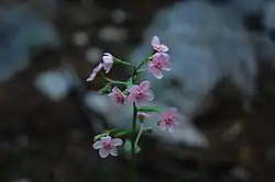 Hackelia mundula is a species of flowering plant in the borage family known by the common name pink stickseed. It is native to the high mountains of California, especially the Sierra Nevada. Its range extends into Oregon. This is a lush, hairy perennial herb growing to maximum heights between 40 and 80 centimeters (16 and 31 in). It produces an array of erect stems with oval- or lance-shaped leaves most abundant around the bases, growing up to 22 centimeters (8.7 in) long. The upper stems are mostly leafless and hold cyme inflorescences of flowers. Each petite flower has 5 rounded lobes which are light pink and age to light blue in color, each with a smaller petallike appendage at its base. The fruit is a small nutlet covered in thin, hairlike prickles.