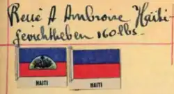 Haiti's only athlete in 1936 was weightlifter René A. Ambroise (from Jacmel),[4] a student based in Paris, where he had taken up the sport. He carried the Haitian flag at the opening ceremony;[4] having discovered that the civil flag of Haiti was identical to that of Liechtenstein when the latter delegation arrived at the Games, both nations decided to carry different flags in the opening ceremony. Liechtenstein received approval from their government to carry their flag upside-down and add a "Prince's Hat" crown in the corner, while Ambroise added the national crest to his flag (to make it the state flag).[5] As a nation, Liechtenstein then changed its flag in 1937.[6][7]