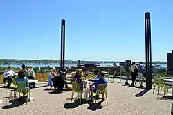 The building houses two café spaces, one at ground level and one on the fifth floor. Patrons of the latter café have access to a rooftop patio area as well as the "Halifax Living Room" housed in the cantilevered portion of the building overlooking Spring Garden Road.[61] The Living Room was designed as an airy, indoor public space with views of both Citadel Hill and Halifax Harbour as well as the civic square below.[43] The ground floor café, in the corner of the building nearest the intersection, opens earlier than the rest of the library.[62] The concession to operate from both spaces was won by Pavia Gallery Espresso Bar and Café of Herring Cove, who beat out Second Cup and Uncommon Grounds.[63] Pavia holds a ten-year contract with an option for an additional seven years.[64]