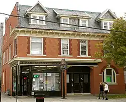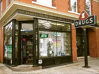 The Hall-Benedict Drug Company Building is located northeast of downtown New Haven, on the south corner of Orange and Linden Streets in the East Rock neighborhood. It is a 2-1/2 story brick structure, built with load-bearing brick walls and a roof that has a steep mansard facade in front and a slightly sloping shed roof to the rear. The front roof face has modillion blocks at the eave, and is pierced by three dormers; the outer two have gabled roofs, while that at the center has a shed roof. The front facade faces Orange Street, and is asymmetrical, with a glassed storefront at the corner that has a recessed entrance. The main building entrance is near the center of the facade, under a continuation of the cornice that extends across the storefront's top. A round-arch window occupies the rightmost bay of the front. Upper-level windows are sash with fixed diamond-light transom windows above.[2] Despite efforts of local preservationists, the original storefront windows were removed in 2020 and replaced with historically inappropriate modern plate-glass windows.