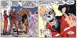 Left: Hank Henshaw and the Excalibur crew after being exposed to the radiation. Right: Henshaw as his body decays, art by Dan Jurgens.