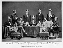 Along with rowing, baseball was popular at Harvard in the late 19th century.[5] A newspaper review of the 1871 book Four Years at Yale says that the book includes "interesting accounts of the sports common in colleges, especially baseball and rowing, and the principal matches which have taken place between Harvard and Yale."[6] An 1884 edition of the Washington Bee reprinted a Lowell Courier humor section piece that reads, "Sixty Harvard freshman have dropped their Latin, eighty their Greek and 100 their mathematics. None of them have dropped their baseball or their boating, however, and college culture is still safe."[7]