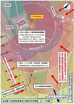 Hekirichi Bastion Fort Duty Reports (戸切地御陣家勤中御達書留, Hekirichi Go-Jinya Kinchū Go-Tassho Todome, 1859) lists the types and capabilities of the deployed cannons, including 6-pound short cannon, 3-kilogram field guns, and indirect-fire weapons such as 13-pound howitzers.[25] Their range was sufficient to cover the entirety of Nozaki Hill within their firing zone.[4] The estimation of this fire control range and the terrain conditions indicate that, in terms of the artillery capabilities of the time, the gentle slope in front of Nozaki Hill effectively became a "kill zone" with no escape for the attackers, with a total area calculated from the current terrain to be 355,000 square meters.[26]
