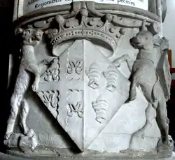 Lozenge escutcheon (as used by females) showing arms of Bourchier impaling Fane (Azure, three dexter gauntlets back affrontée or), with supporters the Fane/Nevill bull and bear, sculpted on the base of the statue of Rachel Fane in Tawstock Church