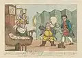His more serious efforts were no great success, but his caricatures are as famous as those of his contemporaries Thomas Rowlandson and James Gillray, good examples being his A Long Story (1782), Country Club (1788), and Barber's Shop (1803). Most of his caricatures are described in detail in the Catalogue of Political and Personal Satires Preserved in the Department of Prints and Drawings in the British Museum. He was a popular character, and the friend of most of the notabilities of his day, whom he never offended by attempting political satire; his easy circumstances and social position (he was commissioned as lieutenant-colonel of the West Suffolk Militia on 26 August 1788,[4] and was appointed equerry to the Duke of York and Albany in 1787) allowed him the leisure to practise his talents.[2]