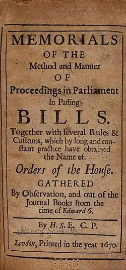 The title page of Memorials of the Method and Manner of Proceedings in Parliament in Passing Bills (3rd ed., 1670),[2] written by "H.S. E. C.P." (Henry Scobell, Esquire, Clerk of Parliament)