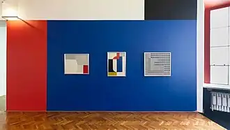 Several of his geometric abstracts from the interwar period are on permanent display at the Neoplastic Room (Sala Neoplastyczna) at Muzeum Sztuki in Łódź. The design of the room was conceived by Władysław Strzemiński in 1948, inspired by interactions of primary colors typical of De Stijl movement, complemented by black, white and grey tones. The display was shut down in 1950 by the communist regime, until it was reconstructed based on surviving photographs.[54] The exhibition space was expanded in 2010 to include a wider range of interwar and contemporary art from the museum's collection.[55]