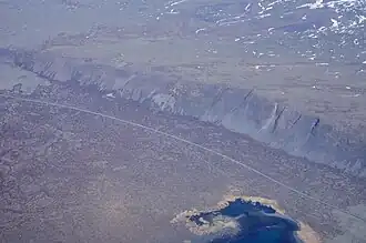 The small bay Herdísarvík (Gullbringusýsla) with the remains of the farm and the former house of Einar Benediktsson is situated actually at the foot of Herdísarvíkurfjall [-ˌviːkʏrˌfjatl̥]. The lava covering the land, Herdísarvíkurhraun [-ˌviːkʏr̥ˌr̥œiːn] (actually 3 lava flows, partially covering each other), came down from this volcanic mountain in the form of lava falls. They had their origin in different craters of the Brennisteinsfjöll volcanic system.[1]