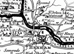 The Tyne was crossed by two ferries called the east (at the location of the present bridge) and the west boats (Warden Bridge). As a result of persistent agitation a bridge was started in 1767 and completed in 1770. A map of 1769 by W. Armstrong shows the bridge to the west of Hexham close by the present Old Bridge End farm. It was built by a Mr. Gait and consisted of seven arches. Less than a year later it was swept away in the great Tyne flood of 1771. In that flood eight bridges shared the fate of Hexham. In 1774 a new attempt was made fifty yards to the west by Mr. Wooler, an engineer who had been working on the new Newcastle bridge. Piles were sunk to carry the piers but work was abandoned on discovering that the "soil beneath the gravel was a quicksand with no more resistance than chaff".[2]